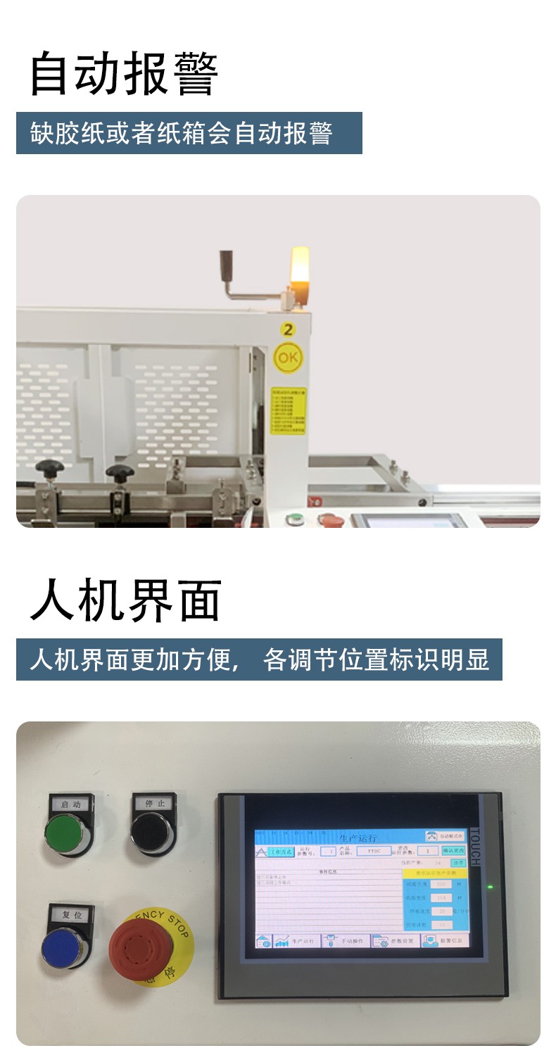 設(shè)備通過 PLC 程序精準(zhǔn)控制每一步動(dòng)作(如吸箱力度、折邊角度、膠帶粘貼壓力),確保所有紙箱的