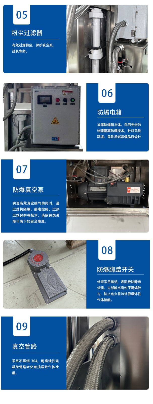 - 密封與過(guò)濾部件:機(jī)頭柜和電柜均采用全密封設(shè)計(jì)并加裝密封膠條,防止易燃易爆氣體、粉塵進(jìn)入內(nèi)部損壞元件或引發(fā)短路;關(guān)鍵的抽氣口、真空室等采用 304 不銹鋼材質(zhì),部分機(jī)型還配有 40mm 厚的有機(jī)玻璃透明觀察窗,既保障防爆性能又便于觀察包裝過(guò)程;同時(shí)加裝粉末隔離和過(guò)濾裝置,防止包裝物料中的粉塵堵塞真空泵,避免設(shè)備故障導(dǎo)致的安全問(wèn)題。