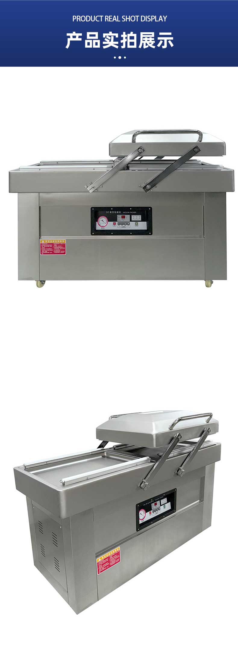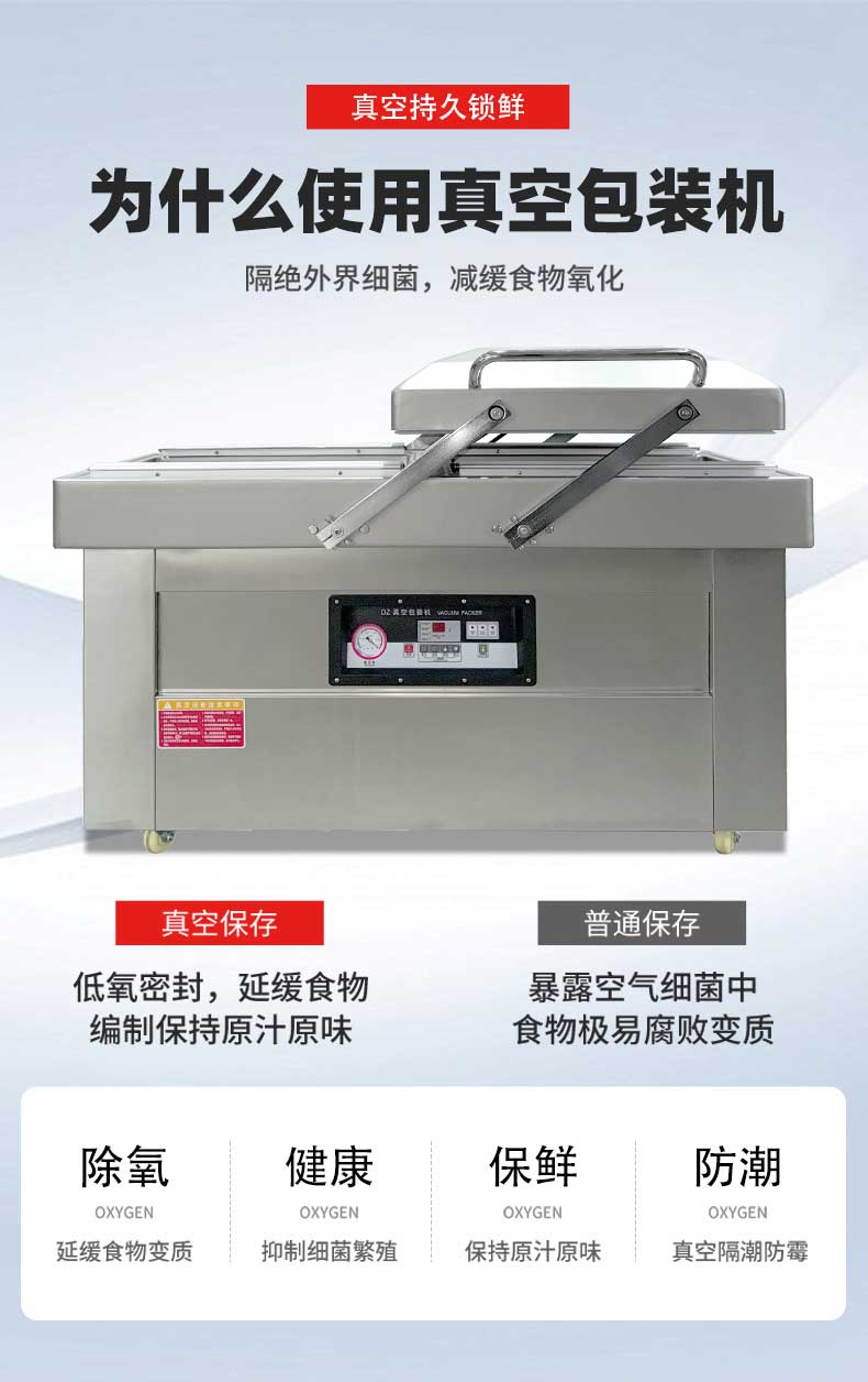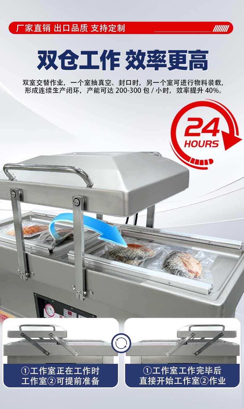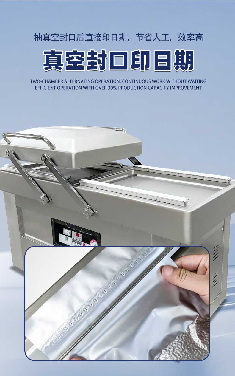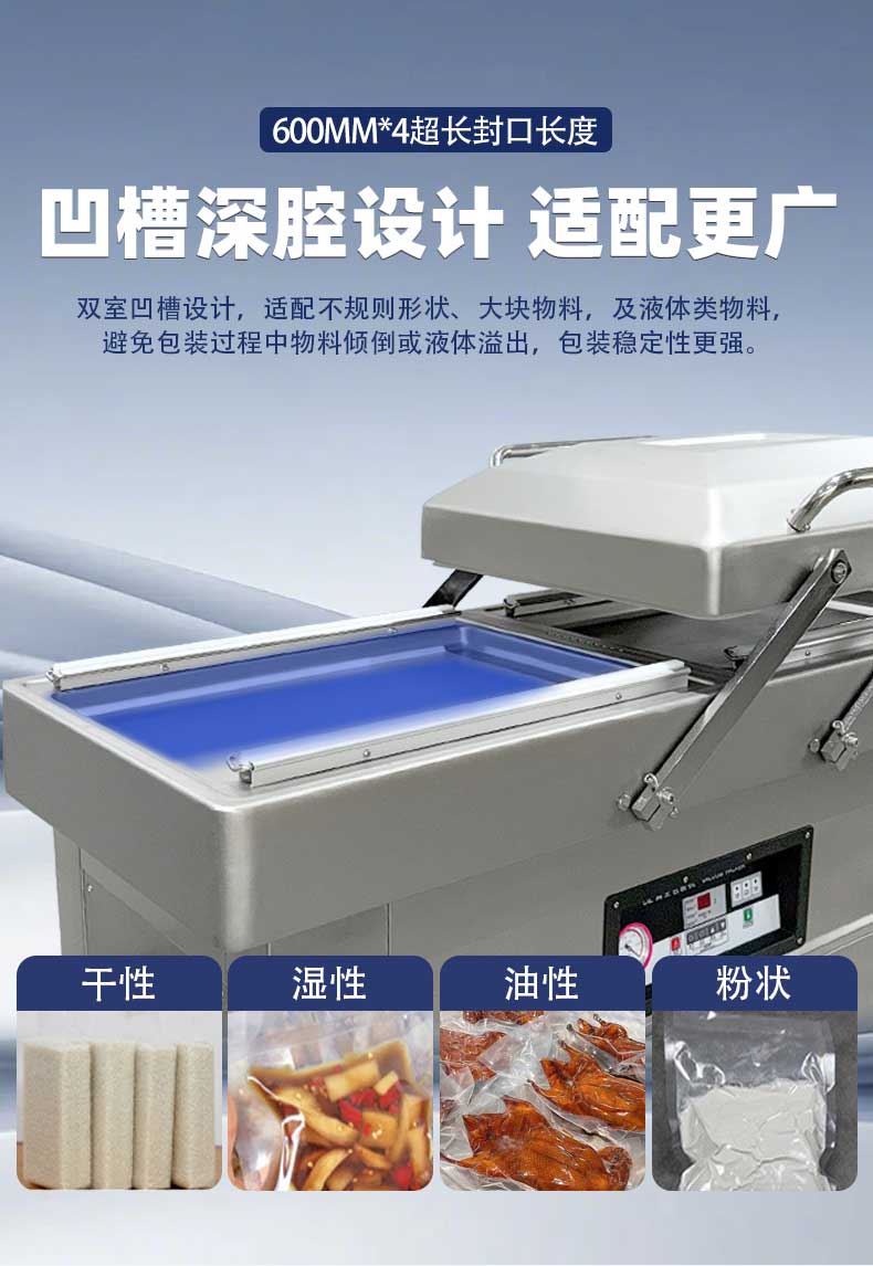 在鹵味飄香的熟食店、水產豐富的漁港作坊、預制菜量產的食品工廠中,帶湯汁、高水分產品的包裝始終是行業(yè)痛點——傳統(tǒng)真空機易漏液、效率低、保鮮差的問題,往往導致食材損耗、客訴頻發(fā)。雙室凹槽真空機專為這類產品量身打造,以“防漏鎖鮮+高效量產”為核心,通過結構創(chuàng)新與技術升級,成為鹵味、水產、預制菜行業(yè)的包裝利器。針對鹵味鹵汁、水產冰衣、預制菜湯汁等特殊屬性,設備在真空系統(tǒng)、密封結構、操作邏輯上實現(xiàn)全維度優(yōu)化,從源頭規(guī)避包裝風險。