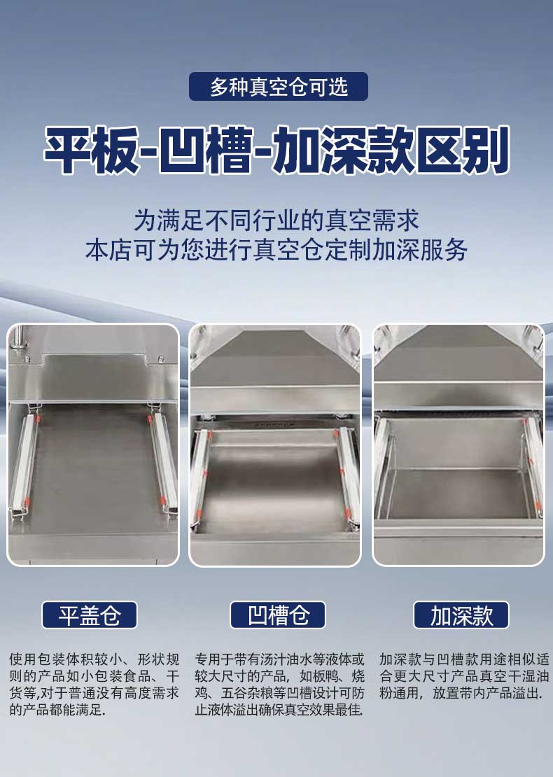 設備核心創(chuàng)新在于真空室的凹槽式設計,真空室內腔下凹深度可達10-40厘米(支持定制),鹵味拼盤、整只帶湯燒雞、大份預制菜等產品可垂直或傾斜放置,袋內湯汁自然匯聚于凹槽底部,與封口線形成安全距離。配合“液體防吸智能程序”,設備采用“先微壓排氣再深度抽真空”的梯度模式,緩慢排出袋內空氣的同時避免湯汁飛濺,解決了傳統(tǒng)設備抽真空時“噴液進泵”的維修難題。