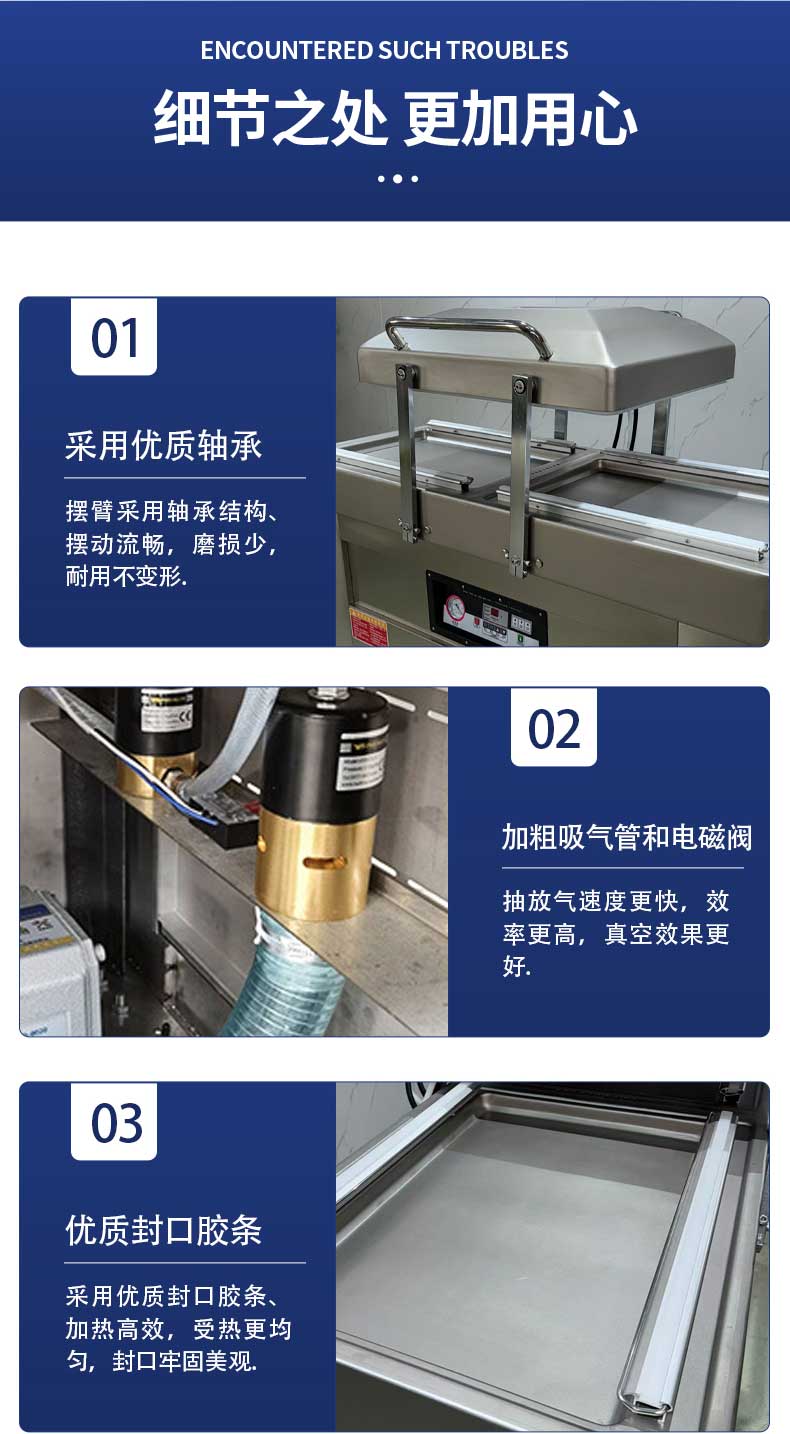 雙室結構是設備的效率核心——兩個真空室通過微電腦程序控制實現(xiàn)交替運作,當左側真空室完成抽氣、封口、冷卻的全流程時,右側真空室已完成物料擺放待命,真正實現(xiàn)“不停機連續(xù)工作”。搭配上海知名品牌大功率真空泵,雙泵獨立運作抽氣速率可達2×20m3/h,單室機每小時最多包裝160次。