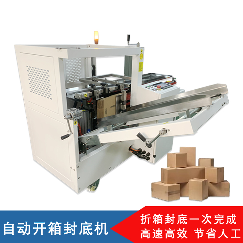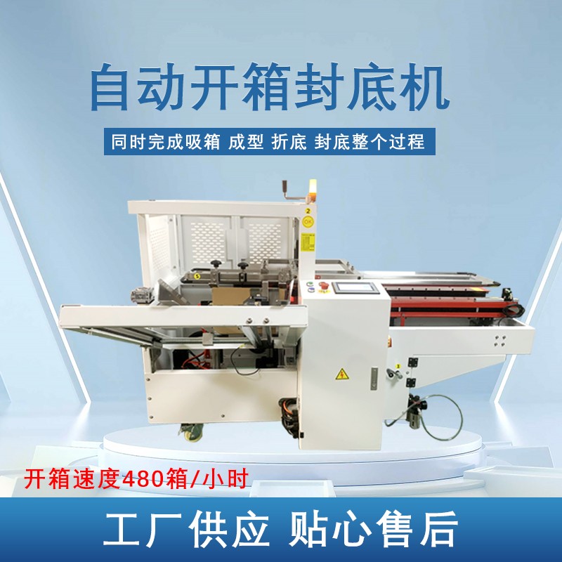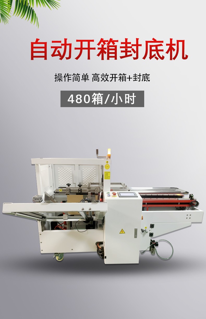 自動(dòng)開箱封底機(jī)一次完成紙箱吸箱、開箱、成型、折底、封底等包裝工序,可大大減少生產(chǎn)人員和勞動(dòng)強(qiáng)度。