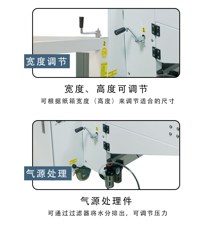 - 紙箱適應(yīng)性強(qiáng):適用紙箱范圍廣,不同大小紙箱調(diào)整簡(jiǎn)便快捷,變換紙箱規(guī)格時(shí),手動(dòng)調(diào)整一般只需 1-2 分鐘。