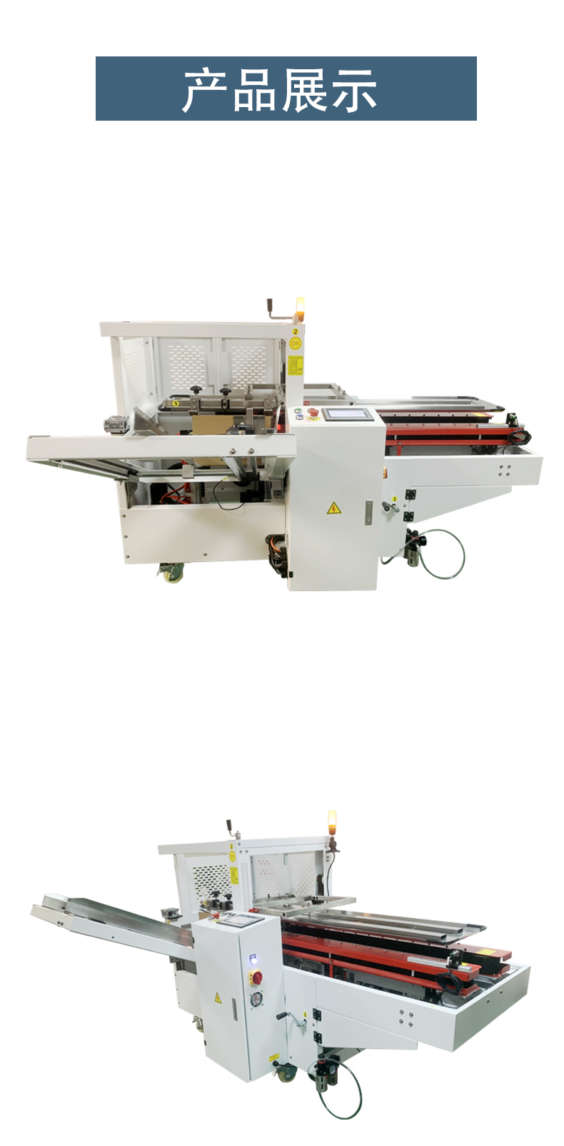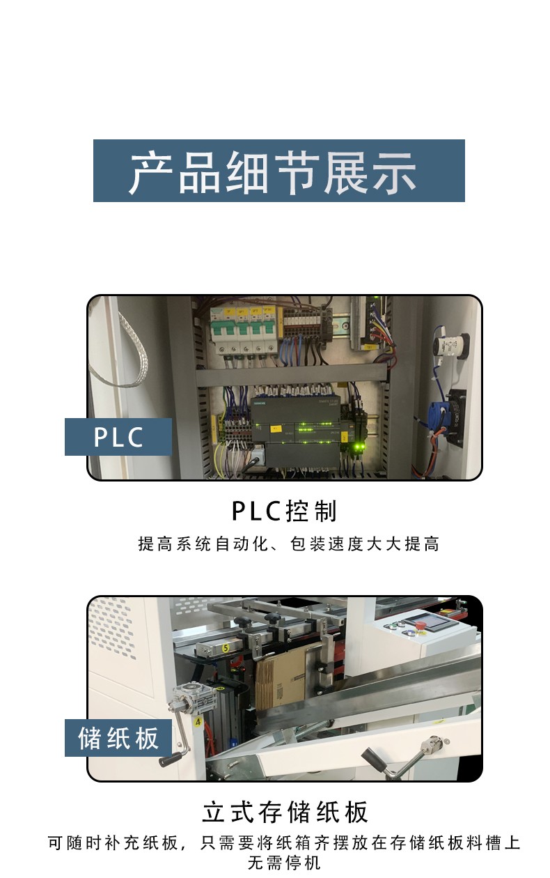 - 自動(dòng)化程度高:一次完成紙箱吸箱、開箱、成型、折底、封底等包裝工序,可大大減少生產(chǎn)人員和勞動(dòng)強(qiáng)度。