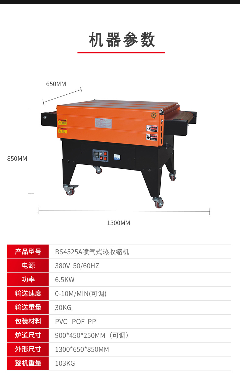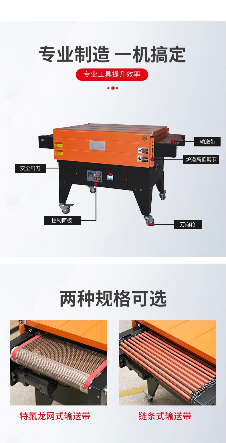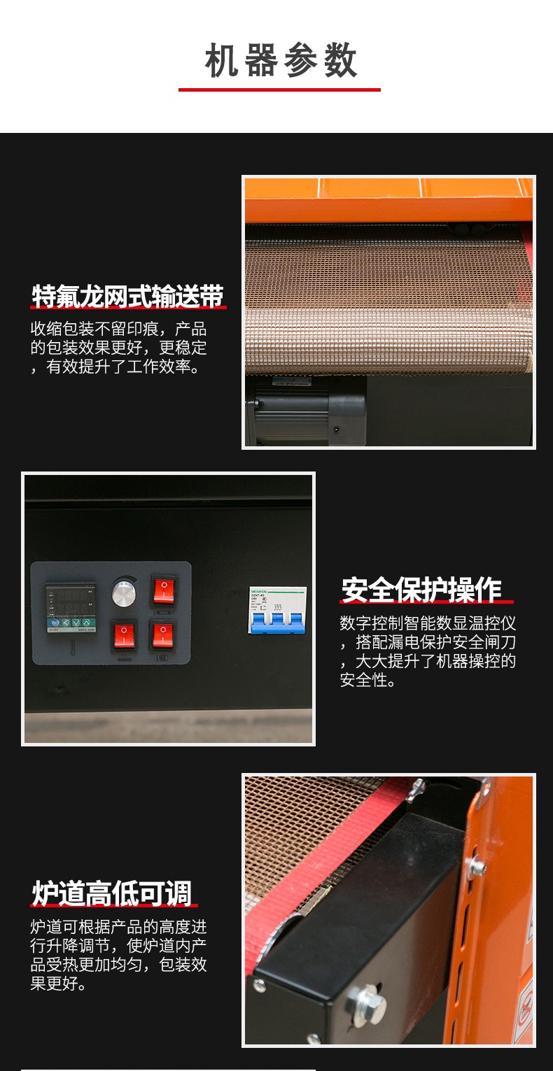 - 收縮溫度范圍:一般為 120 - 200℃。不同的熱收縮薄膜有不同的最佳收縮溫度,在選型時(shí)要考慮機(jī)器的溫度范圍是否能夠滿(mǎn)足所使用薄膜的要求。例如,PVC 薄膜的收縮溫度一般在 140 - 160℃,POF 薄膜的收縮溫度約為 160 - 180℃。