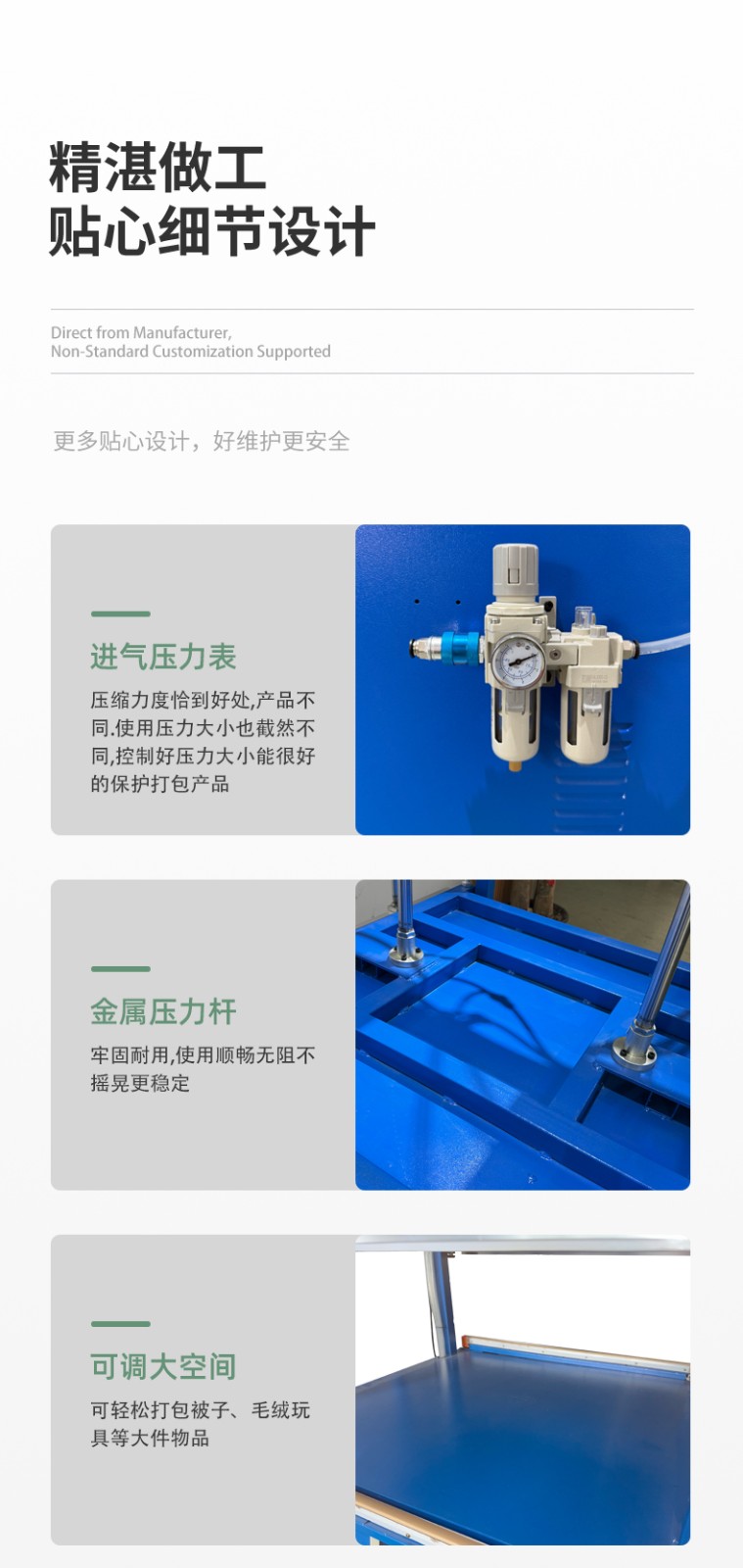 雙工位壓縮封口機:兩個工位可同時作業,一邊封口時另一個可放件 / 取件,適合中小批量、多規格產品(如多口味食品、電子元件袋),效率比單工位高 50%-80%。