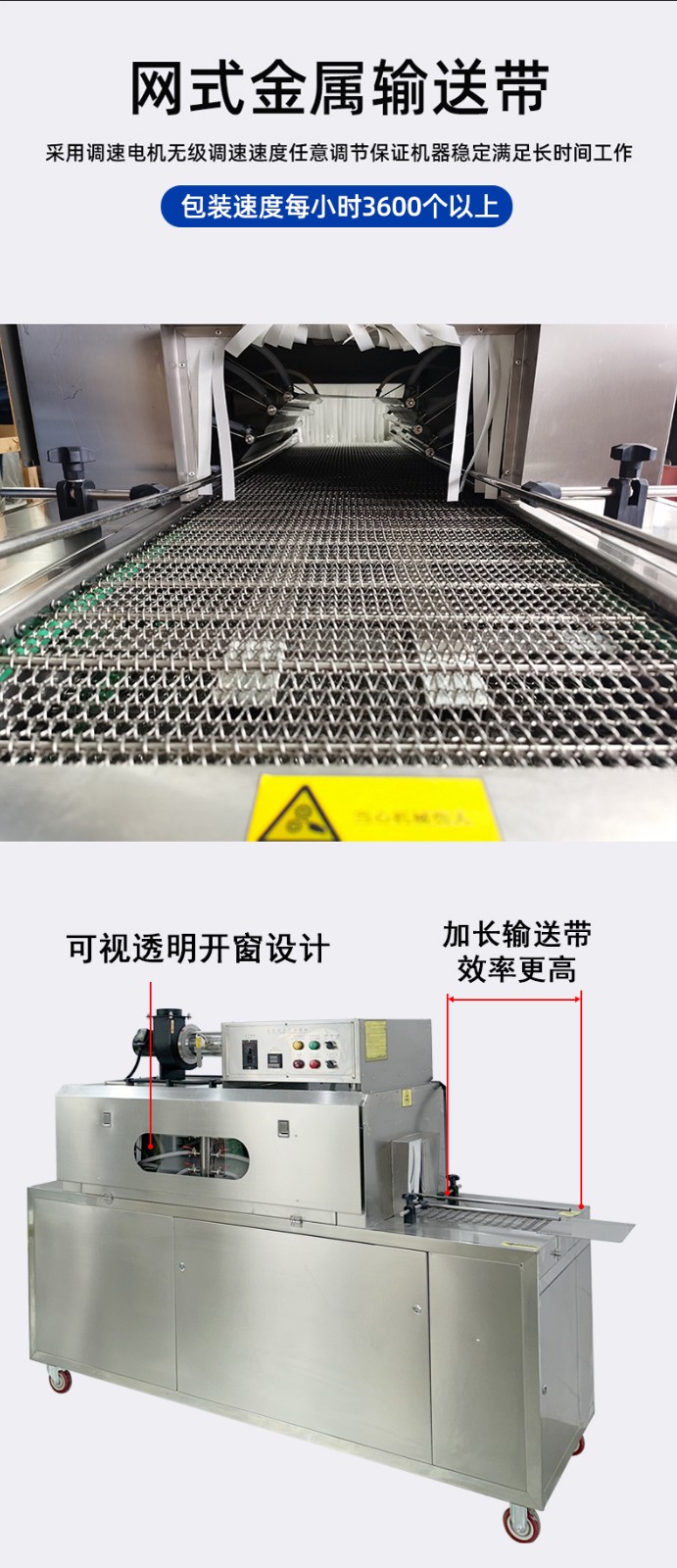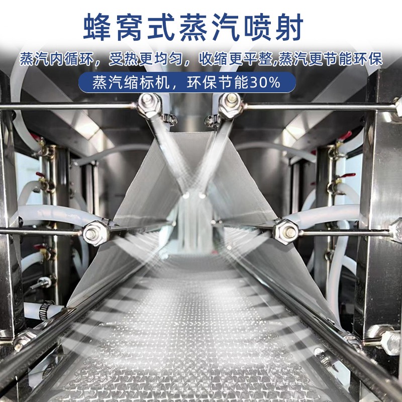 - 智能控溫,適配多類膜材配備 PLC 智能控制系統,可精準調節蒸汽溫度(50℃-120℃可調)、輸送速度與蒸汽噴射量,兼容 POF、PVC、PE 等多種熱收縮膜材,滿足不同產品的包裝厚度與質感要求。